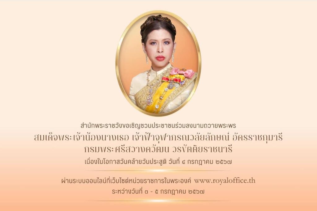 สำนักพระราชวัง ขอเชิญชวนประชาชนร่วมลงนามถวายพระพร สมเด็จพระเจ้าน้องนางเธอ เจ้าฟ้าจุฬาภรณวลัยลักษณ์ อัครราชกุมารี กรมพระศรีสวางควัฒน วรขัตติยราชนารี เนื่องในโอกาสวันคล้ายวันประสูติ วันที่ ๔ กรกฎาคม ๒๕๖๗ ผ่านระบบออนไลน์ ที่เว็บไซต์หน่วยราชการในพระองค์ www.royaloffice.th ระหว่างวันที่ ๓ – ๕ กรกฎาคม ๒๕๖๗