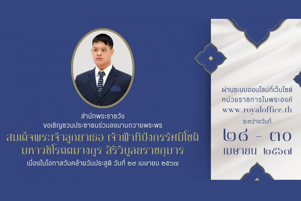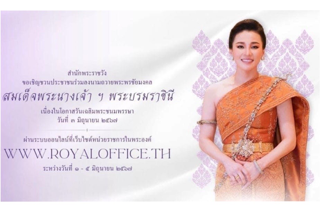 สำนักพระราชวัง ขอเชิญชวนประชาชนร่วมลงนามถวายพระพรชัยมงคล สมเด็จพระนางเจ้า ฯ พระบรมราชินี เนื่องในโอกาสวันเฉลิมพระชนมพรรษา วันที่ ๓ มิถุนายน ๒๕๖๗ ผ่านระบบออนไลน์ ที่เว็บไซต์หน่วยราชการในพระองค์ www.royaloffice.th ระหว่างวันที่ ๑ – ๕ มิถุนายน ๒๕๖๗