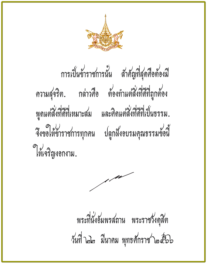 การเป็นข้าราชการนั้น สำคัญที่สุดคือต้องมีความสุจริต กล่าวคือต้องทำแต่สิ่งที่ดีที่ถูกต้อง พูดแต่สิ่งที่ดีที่เหมาะสม และคิดแต่สิ่งที่ดีที่เป็นธรรม จึงขอให้ข้าราชการทุกคน ปลูกฝังอบรมคุณธรรมข้อนี้ให้เจริญงอกงาม